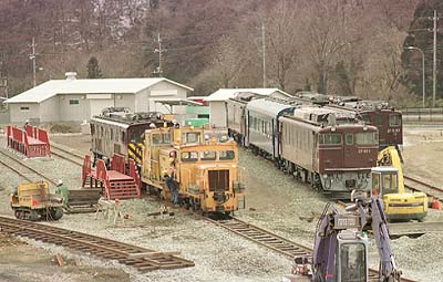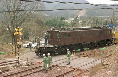 EF59 1号機が2台のモーターカーに牽引され、碓氷峠鉄道文化むらに搬入されました。