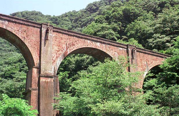 碓氷峠を旧道の国道18号を通ると、思わず立ち止まる場所があります。 アプト式時代の第三橋梁、通称めがね橋です。 202万8000個のレンガからなる、全長90.8m、 高さ18.3mの4連アーチは見る者を圧倒します。 明治25年12月5日完成、平成5年 重要文化財指定。 旧道に案内板があります。