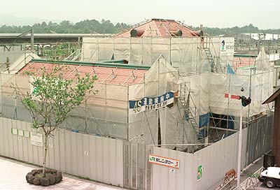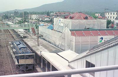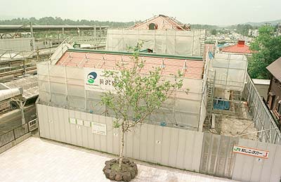 旧軽井沢駅舎 工事現場 左側、中ほどの柱の後ろに EF63 2号機 軽井沢駅前 1999/7/17 旧軽井沢駅舎 工事現場 外観の変化はありませんが、彫り物など 細部の工事も進んでいます。 軽井沢駅前 1999/7/17 EF63 2号機と 旧軽井沢駅舎 しなの鉄道・軽井沢駅 1999/7/17
